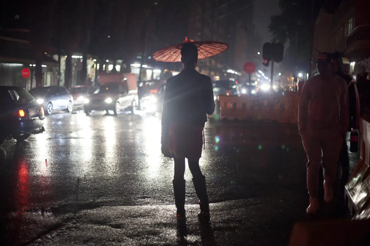 someone under an umbrella at night in a street