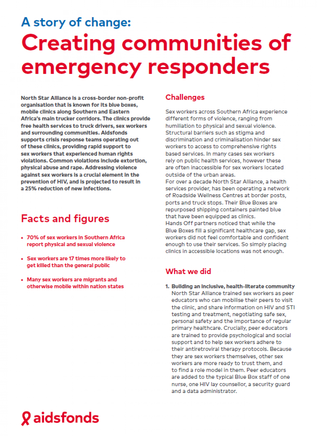 Read a change story on how Aidsfonds supported North Star Alliance clinics to engage with influential community members in the support of sex workers through so-called Crisis Response Teams. The approach works: sex workers feel safer and faceless violence from the community. In the last two years more than 47.000 sex workers received health care and HIV services they need.