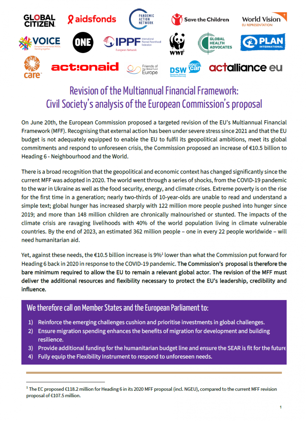 On June 20th, the European Commission proposed a targeted revision of its long-term budget (the EU’s Multiannual Financial Framework or MFF). Recognising that external action has been under severe stress since 2021 and that the EU budget is not adequately equipped to enable the EU to fulfil its geopolitical ambitions, meet its global commitments and respond to unforeseen crisis, the Commission proposed an increase of €10.5 billion to Heading 6 – Neighbourhood and the World. This proposal partially responds to the concerns we raised with other partners here. Partially, this is because we believe that the Commission’s proposal represents the absolute minimum necessary for the EU to maintain its relevance as a global actor and to continue supporting its long-standing partners, including the Global Fund to Fight AIDS, Tuberculosis, and Malaria. The proposal is currently under discussion in the Council, and there is a risk that EU Member States may reject the proposed increase put forward by the Commission.