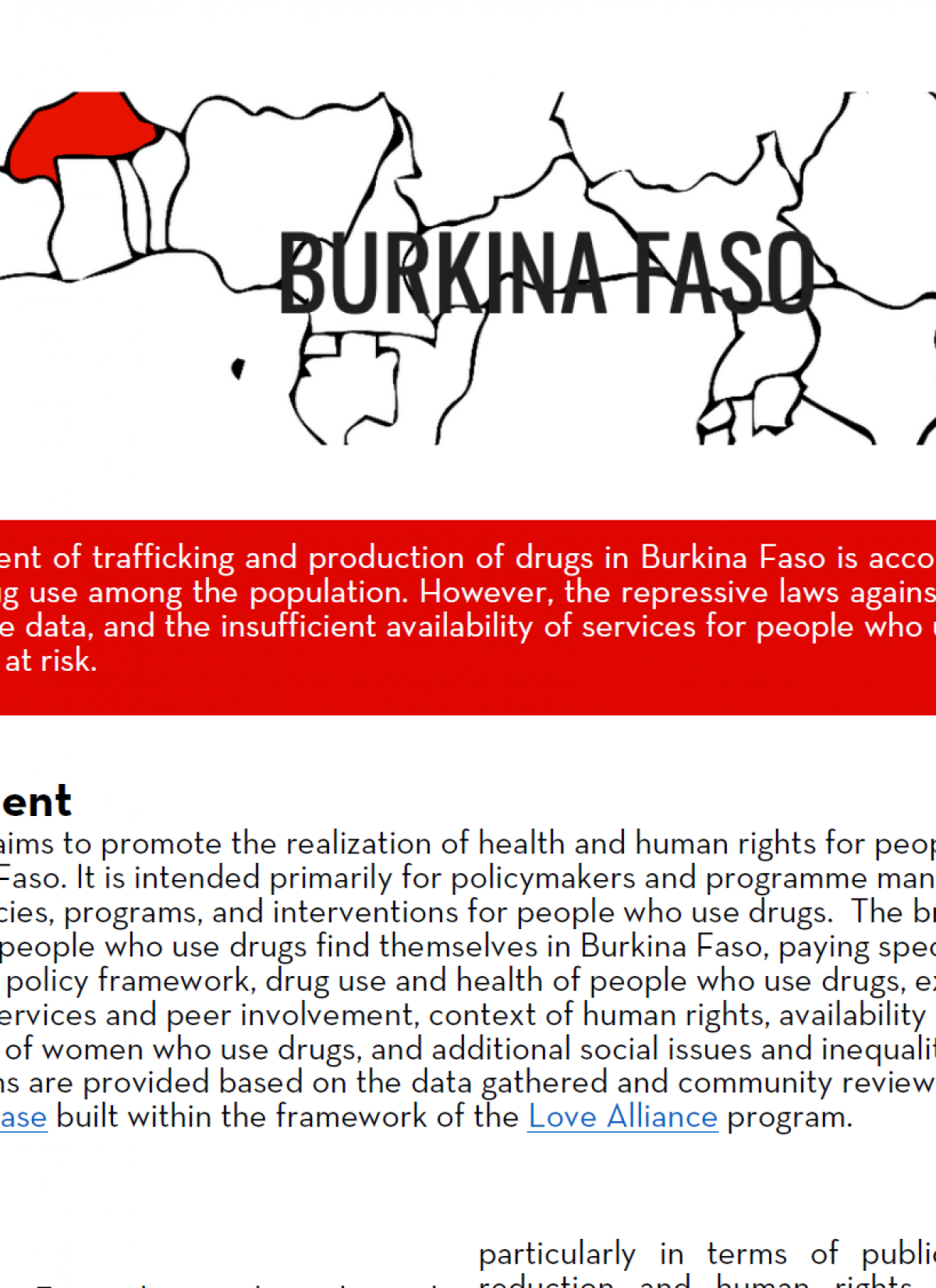 The country policy briefs provide a snapshot of the database. The briefs aim to promote the realisation of health and human rights for people who use drugs in the different countries where the Love Alliance is implementing. The briefs outline the context in which people who use drugs find themselves, paying special attention to the national drug policy framework, drug use and health of people who use drugs, existence of harm reduction services and peer involvement, context of human rights, availability of care in prisons, situation of women who use drugs, and additional social issues and inequalities. Recommendations are provided based on the data gathered and community reviews.