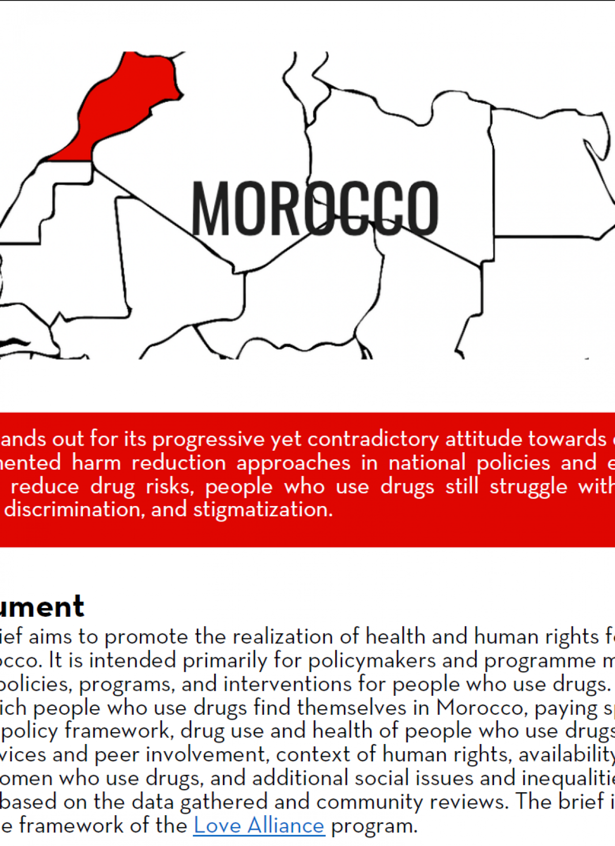 The country policy briefs provide a snapshot of the database. The briefs aim to promote the realisation of health and human rights for people who use drugs in the different countries where the Love Alliance is implementing. The briefs outline the context in which people who use drugs find themselves, paying special attention to the national drug policy framework, drug use and health of people who use drugs, existence of harm reduction services and peer involvement, context of human rights, availability of care in prisons, situation of women who use drugs, and additional social issues and inequalities. Recommendations are provided based on the data gathered and community reviews.