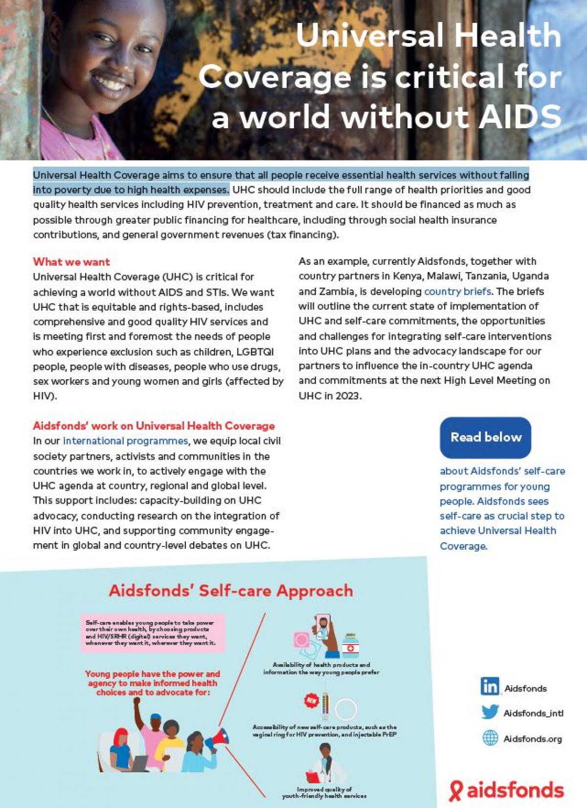 Universal Health Coverage aims to ensure that all people receive essential health services without falling into poverty due to high health expenses. Aidsfonds sees self-care as a crucial step to achieve Universal Health Coverage. This two-pager showcases some recent ambitious self-care projects.